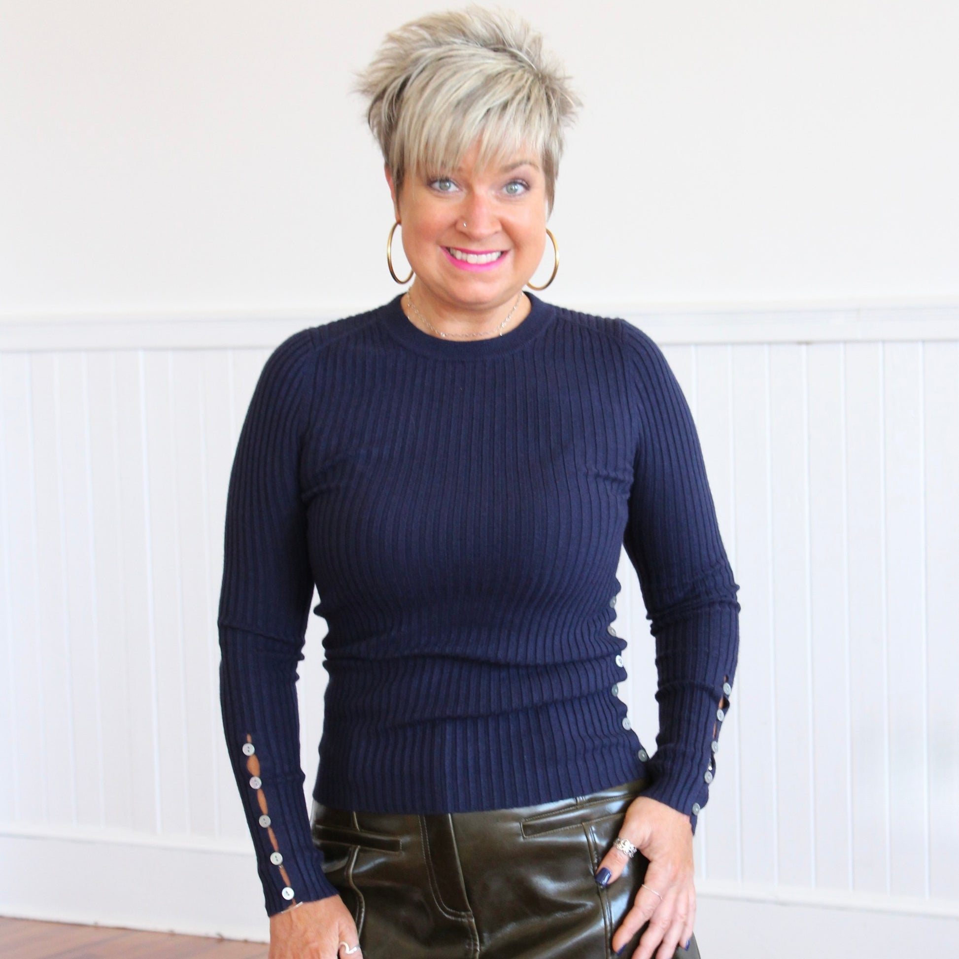 This navy sweater features classic elegance with a modern twist. Crafted from soft, cozy knit fabric, it has a subtle button detail along the sleeves that adds a touch of charm. A small split at the bottom hem gives it a relaxed fit, perfect for layering over jeans or paring with skirts for a polished effortless look.