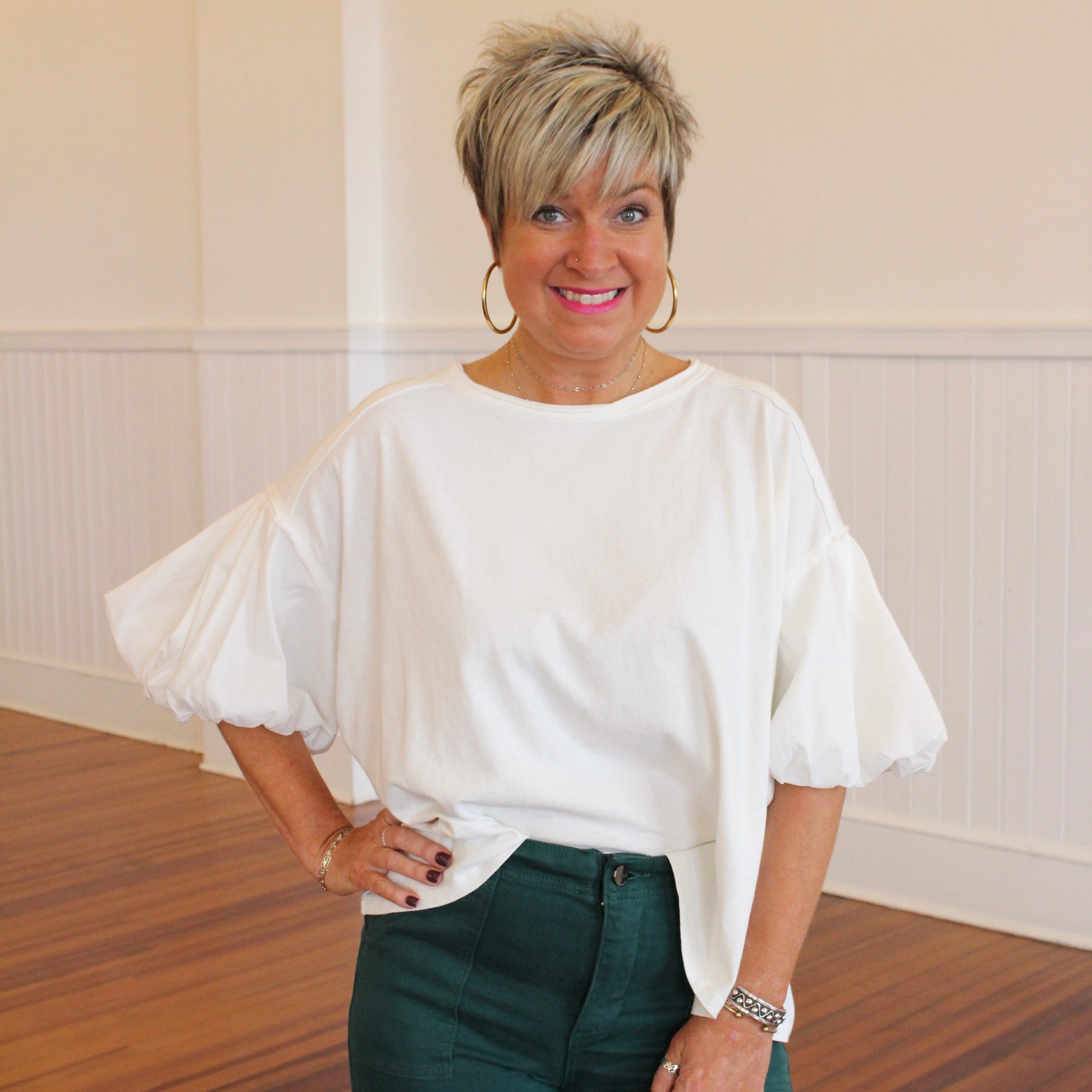 A white top with versatility is a must have in your closet. This mineral washed puff sleeve top is the perfect statement piece to add to any outfit! Easily paired with any color or print, we are loving this top!