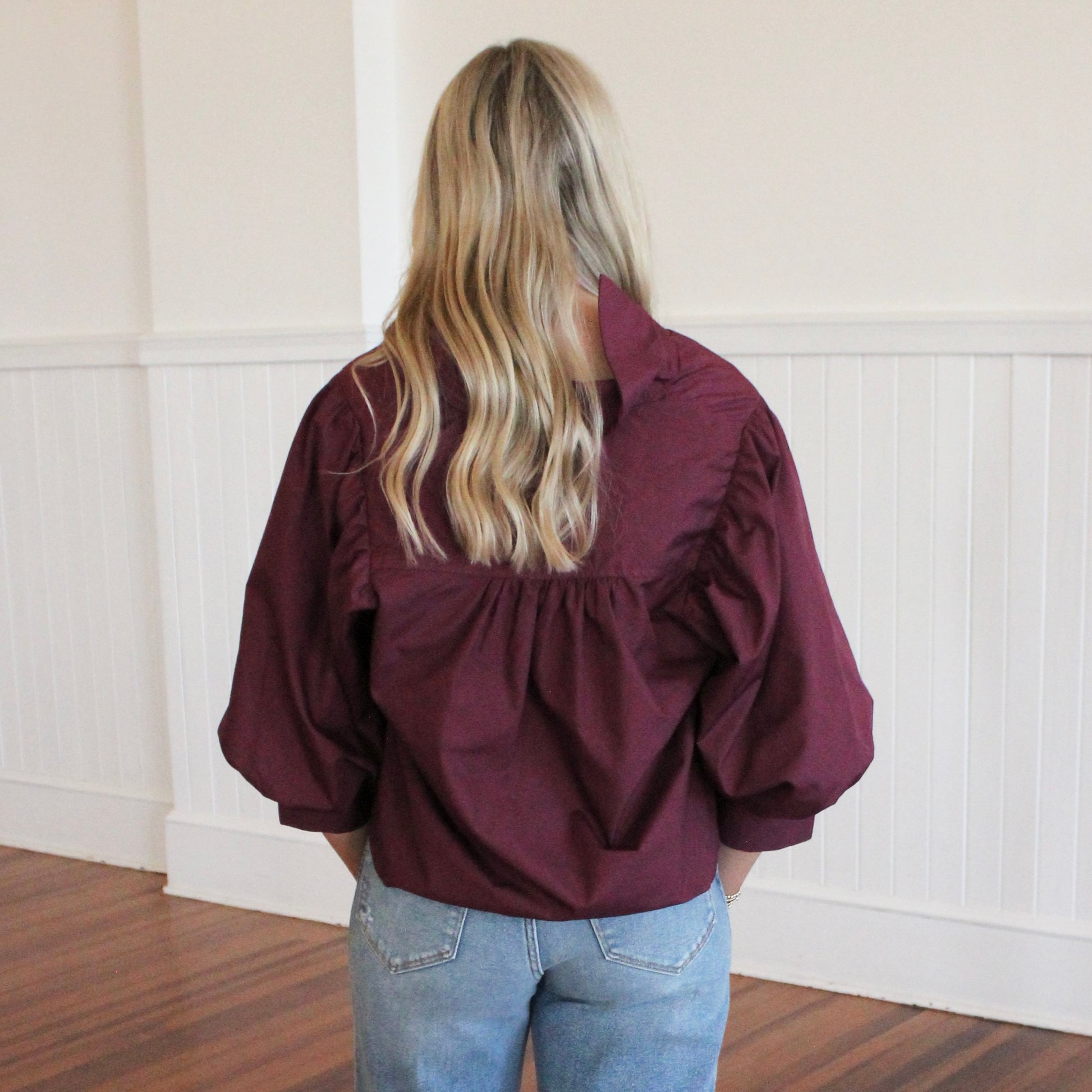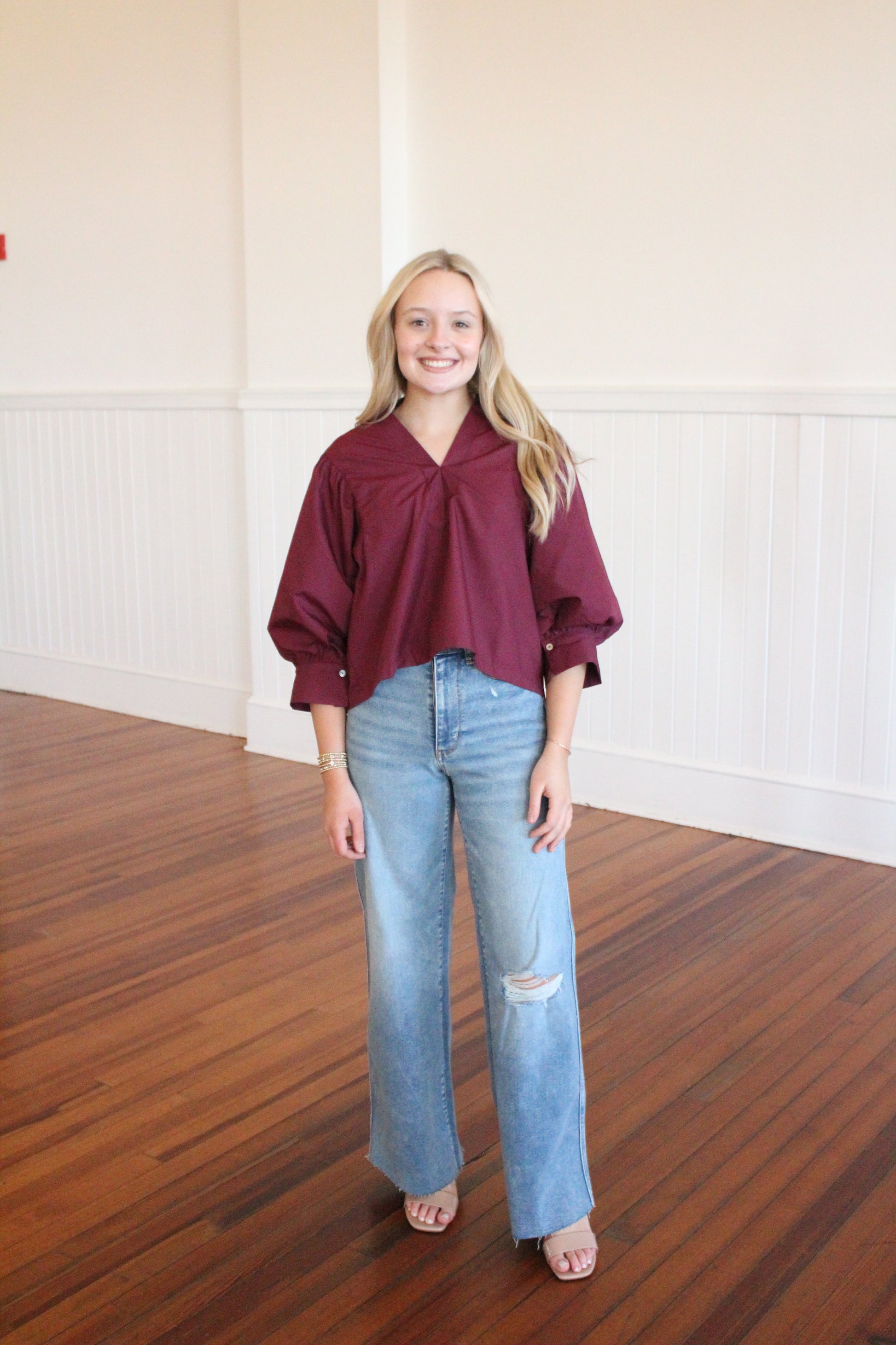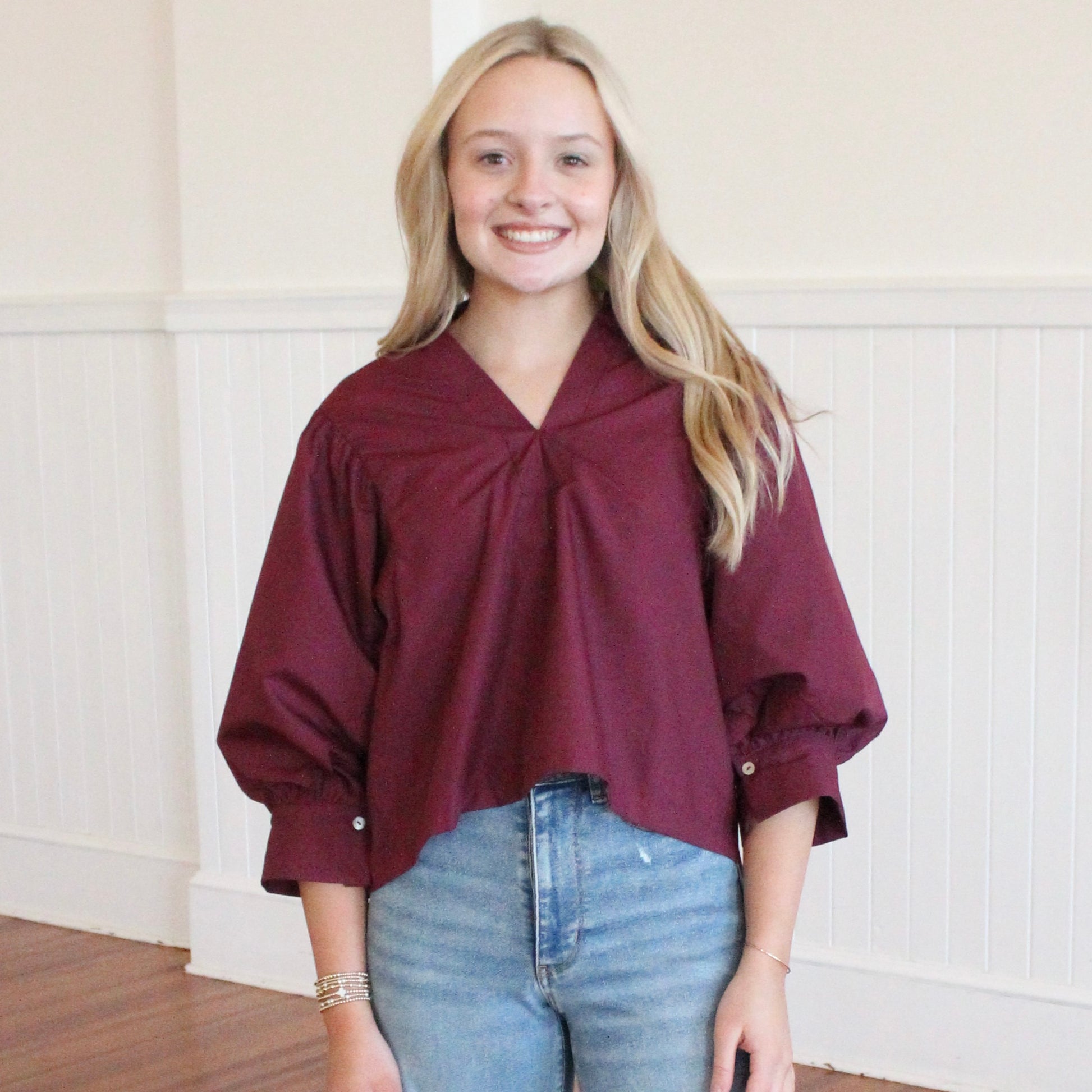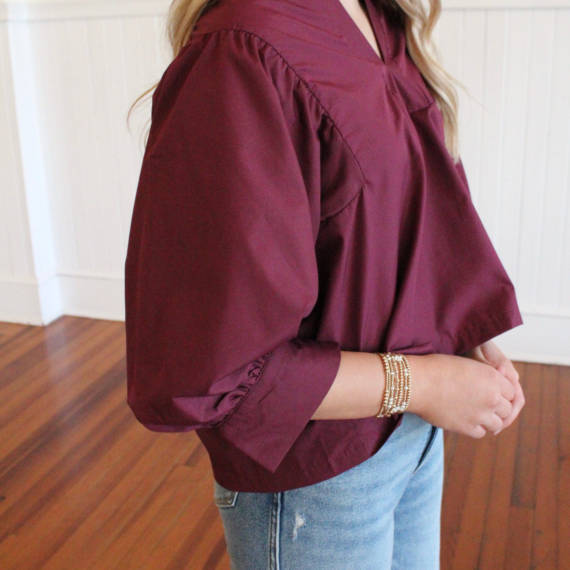 This rich colored blouse can be worn for the holidays, work, or casual! Collared style with v-neck and 3/4 sleeves with button closure at the cuff. Shorter fit to be left untucked for a flattering fit!