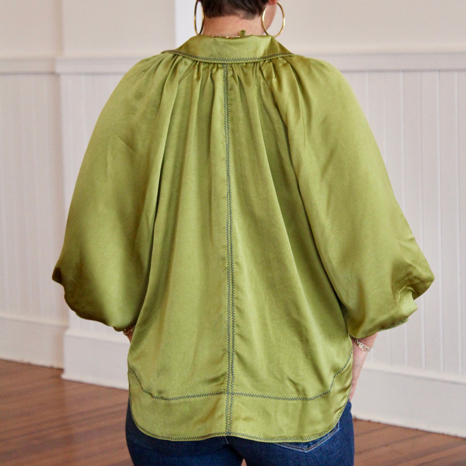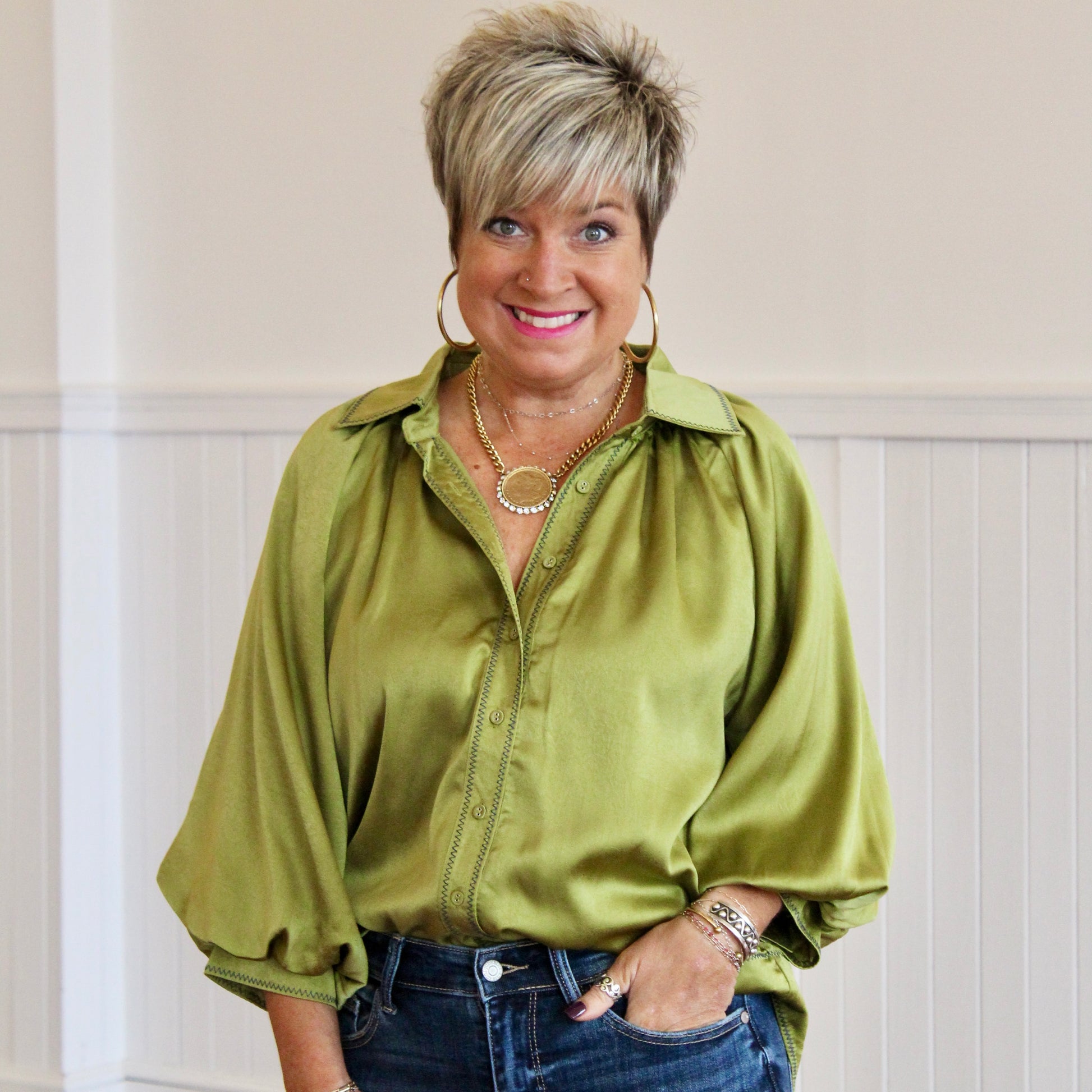 This satin top with balloon sleeves gives such an elegant and timeless look. The button-down blouse is designed with a wavy hem and stitching details that are just the cutest! This top comes in two colors and can easily be dressed up or down.