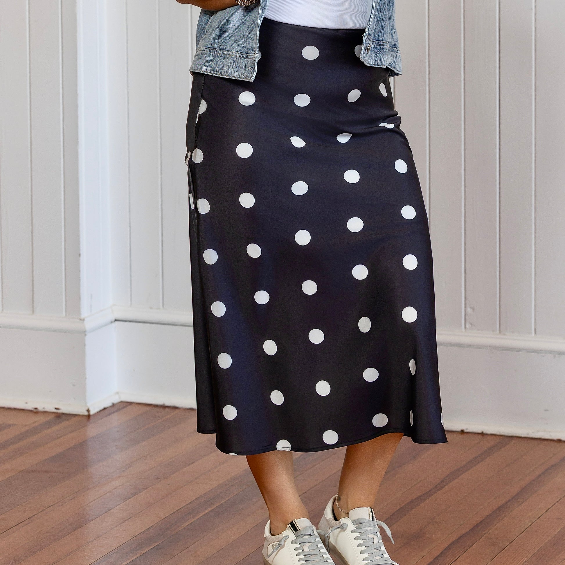 Isn't she CUTE?! Polka dots are trending and you don't want to miss out on this flowy beauty with zipper closure and elastic waistband. Dress this one up or keep it casual!
