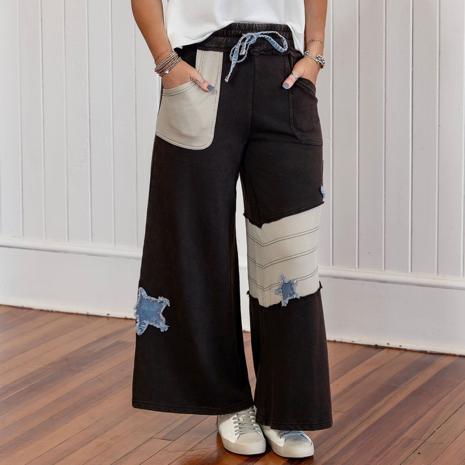 These wide legged mineral washed pants are just what you need in your wardrobe! From denim star patches to mis-matched fabric on the legs and back pockets, these are a must-have!! Wear a basic top or tee for a fun outfit!