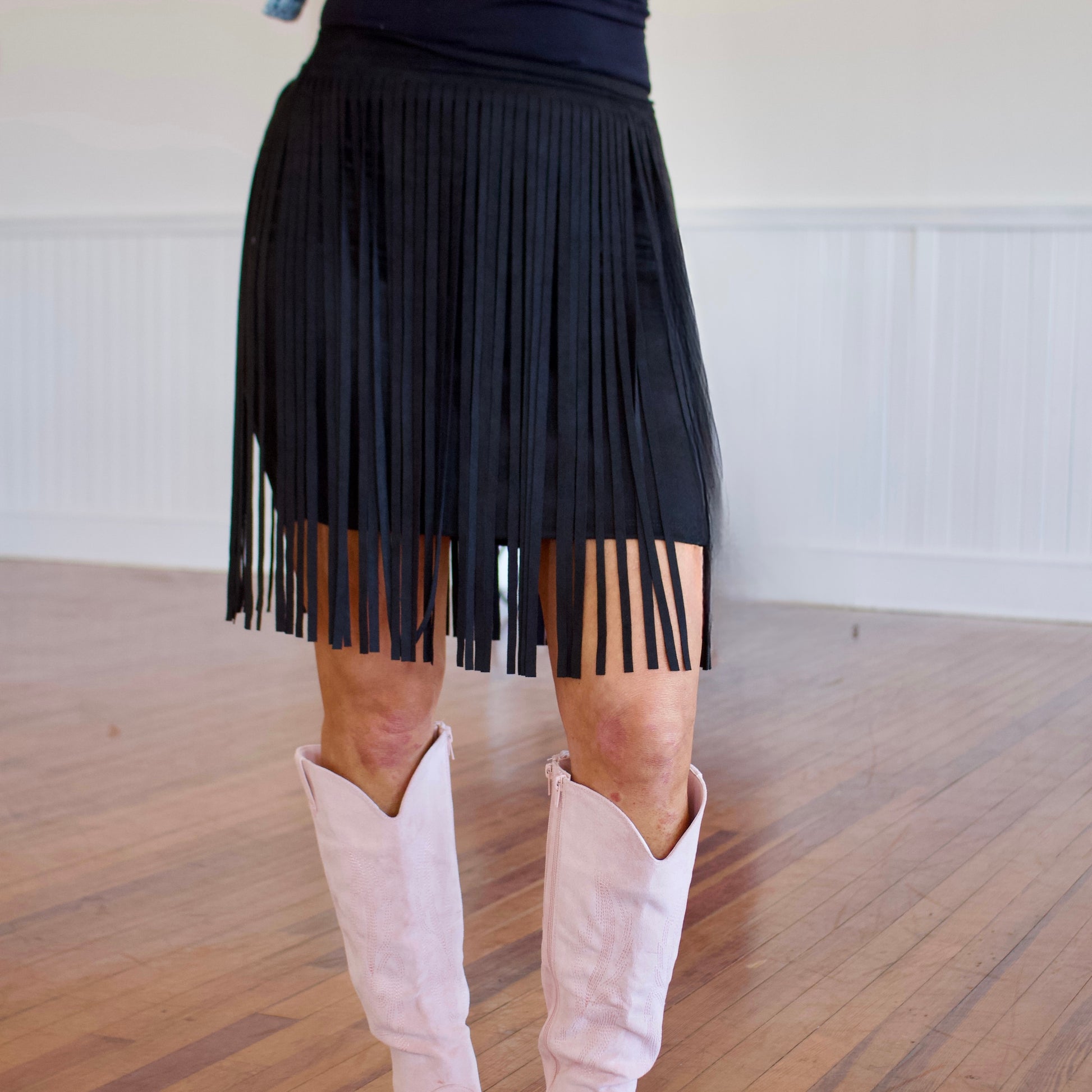 Perfect addition to add some flare to your wardrobe! Suede fringe mini skirt is a stretchy pull-on style! Pair with your favorite cowgirl boots and make a statement!