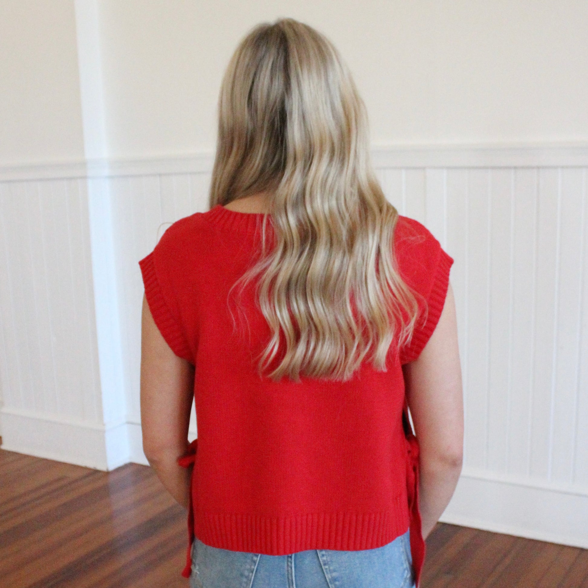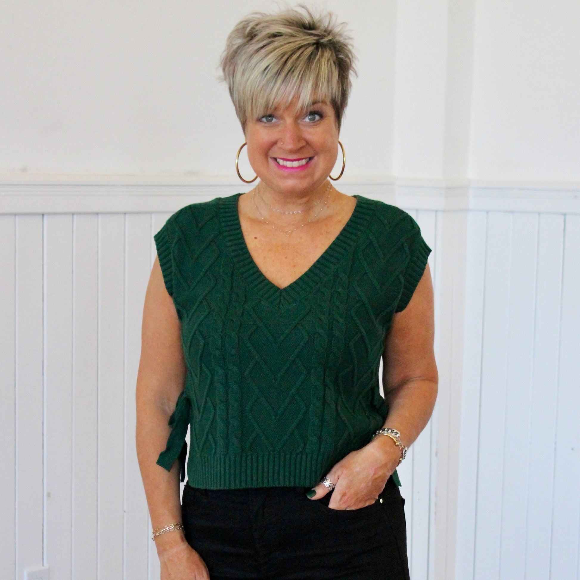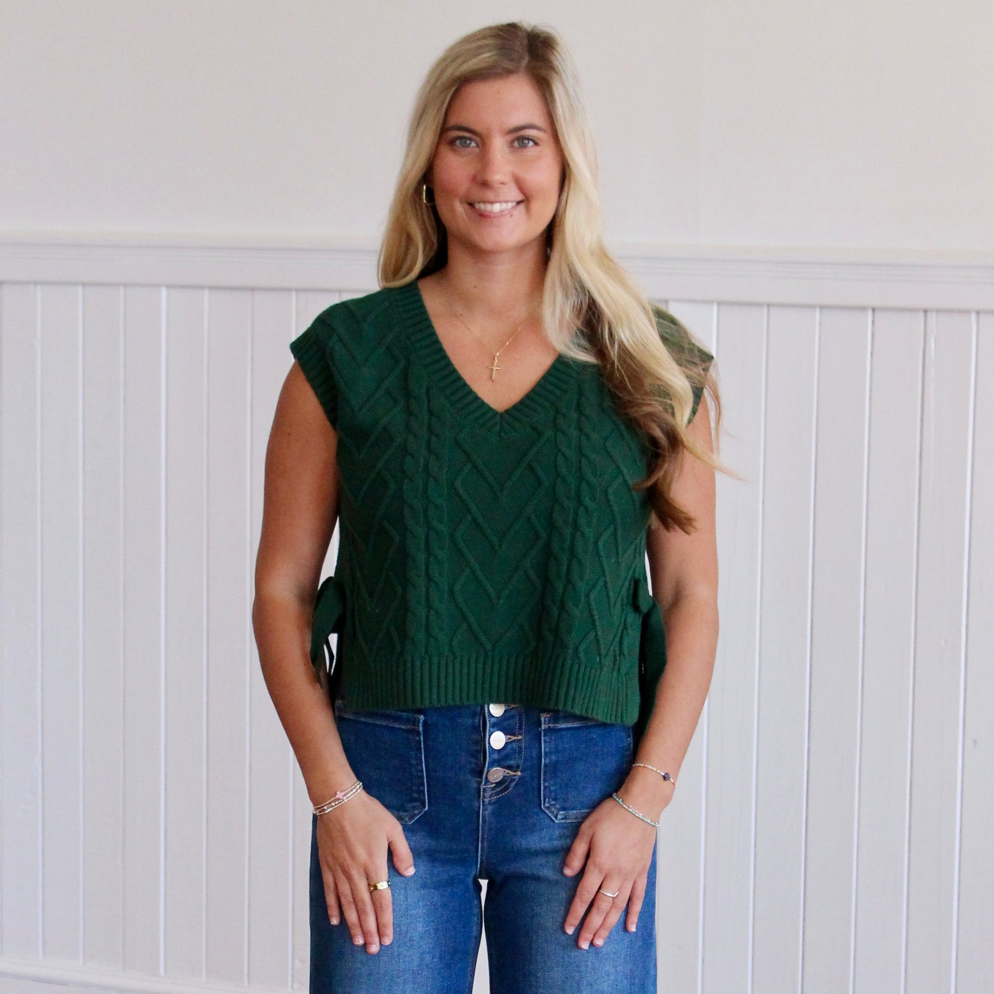 Whether you wear this cable knit sweater vest for the holidays or any other time of the year, this sweater is the perfect addition to your Fall wardrobe! Side tie detail and a relaxed fit. Pair with your favorite jeans for a festive outfit.