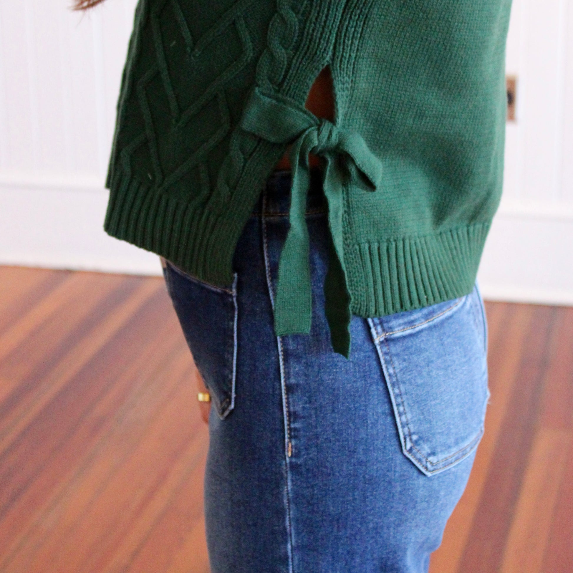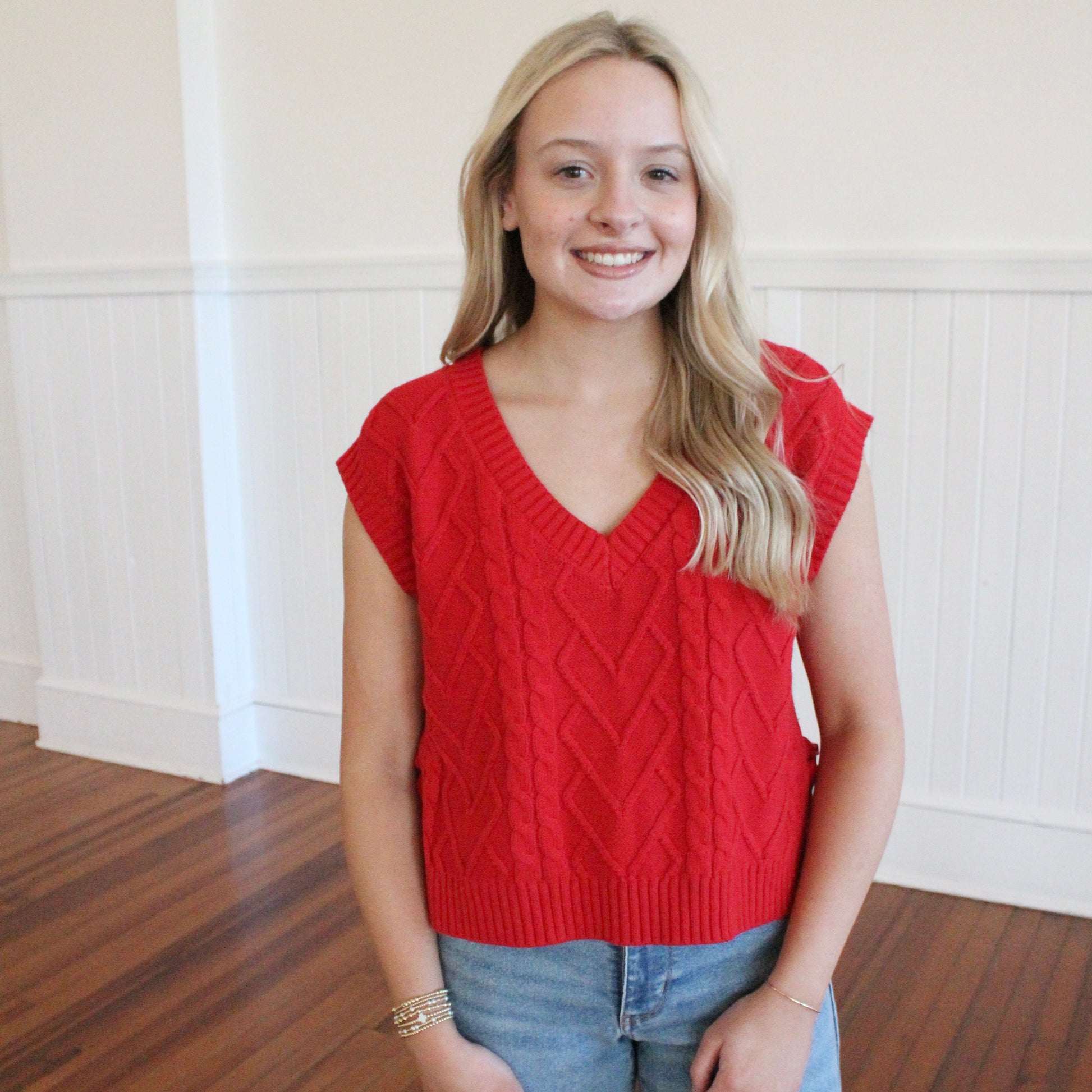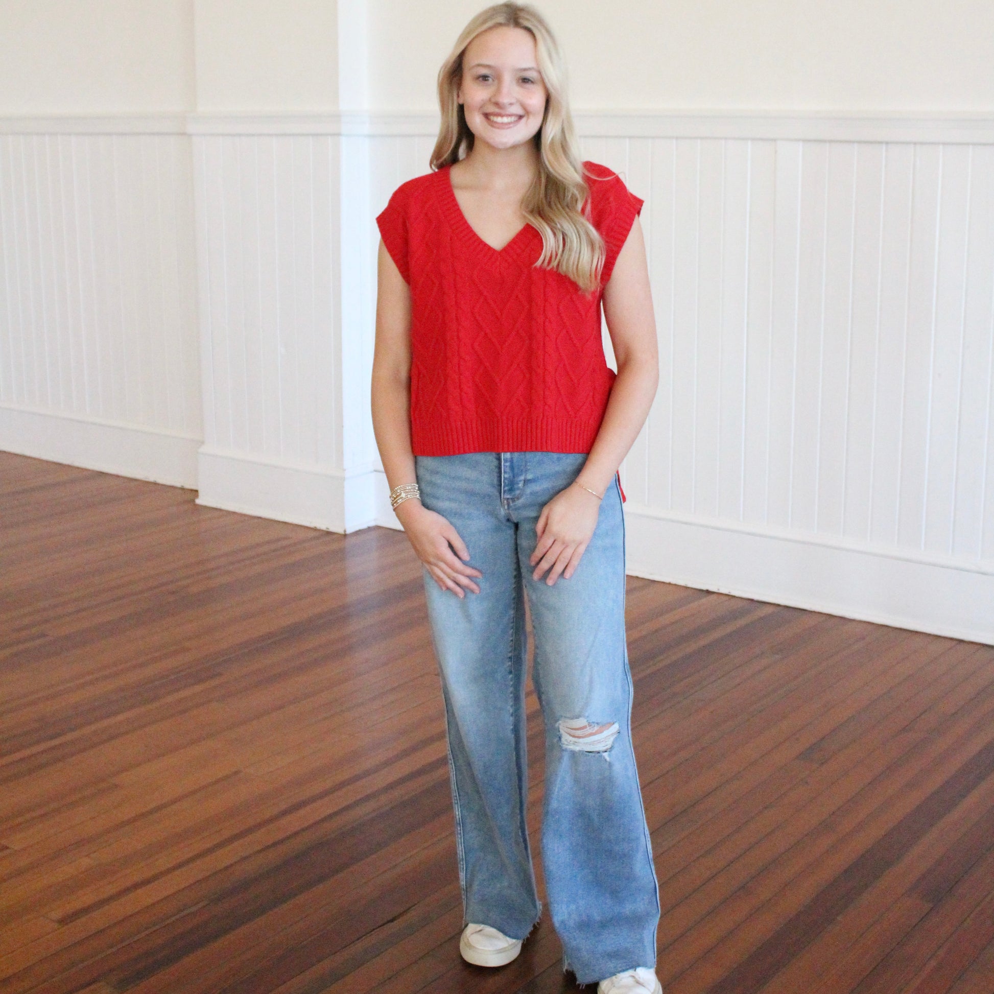 Whether you wear this cable knit sweater vest for the holidays or any other time of the year, this sweater is the perfect addition to your Fall wardrobe! Side tie detail and a relaxed fit. Pair with your favorite jeans for a festive outfit.