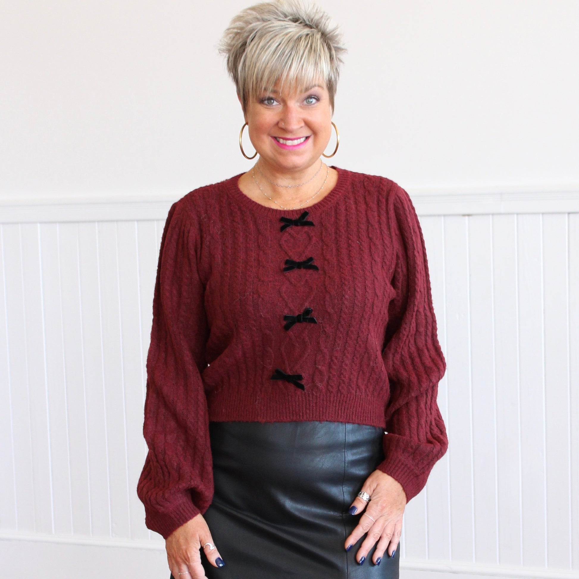 How cute is this sweater for the holidays? This cable knit sweater is giving all of the nostalgic vibes! The velvet bow detailing on the front is our favorite!