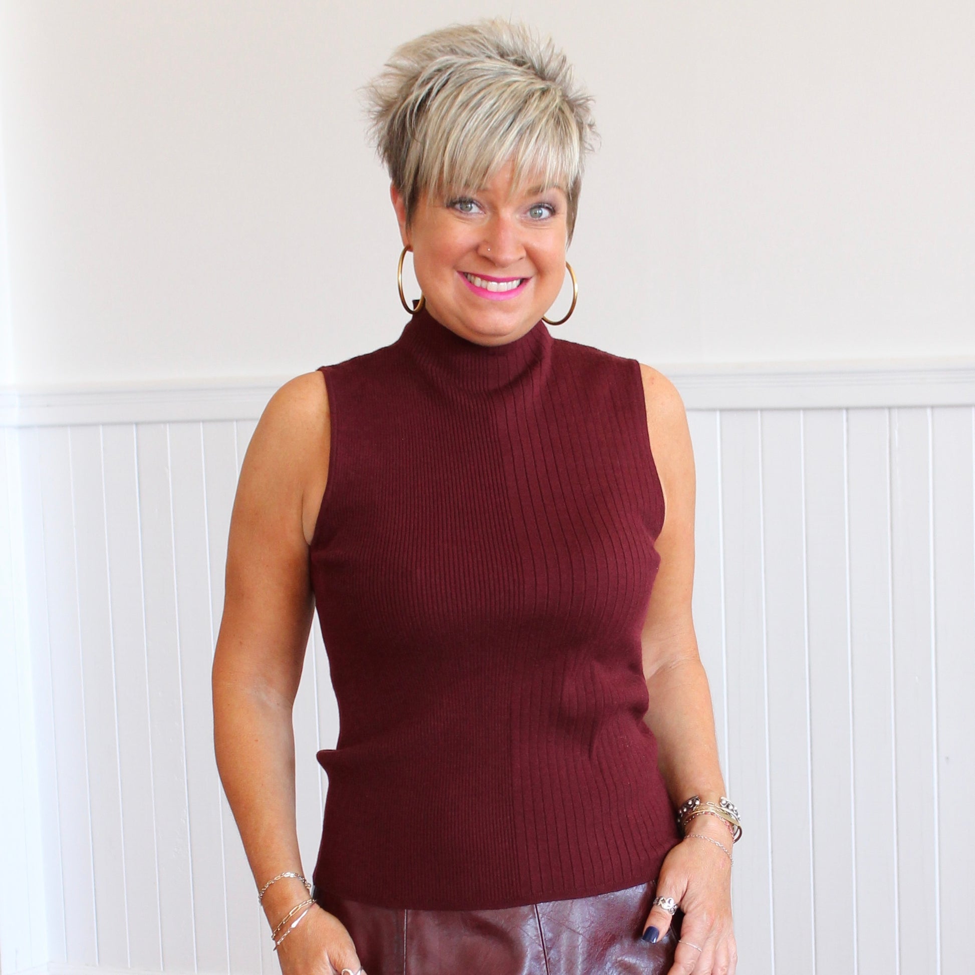 Whether you are getting ready for your holiday look or just a classic style, this sleeveless top will not disappoint! Contrasting ribbed detail on the front making this top unique with a mock neck and flattering fit. Paired with our Oleksa Pleated Skirt for the ultimate look! You will be sure to turn heads!