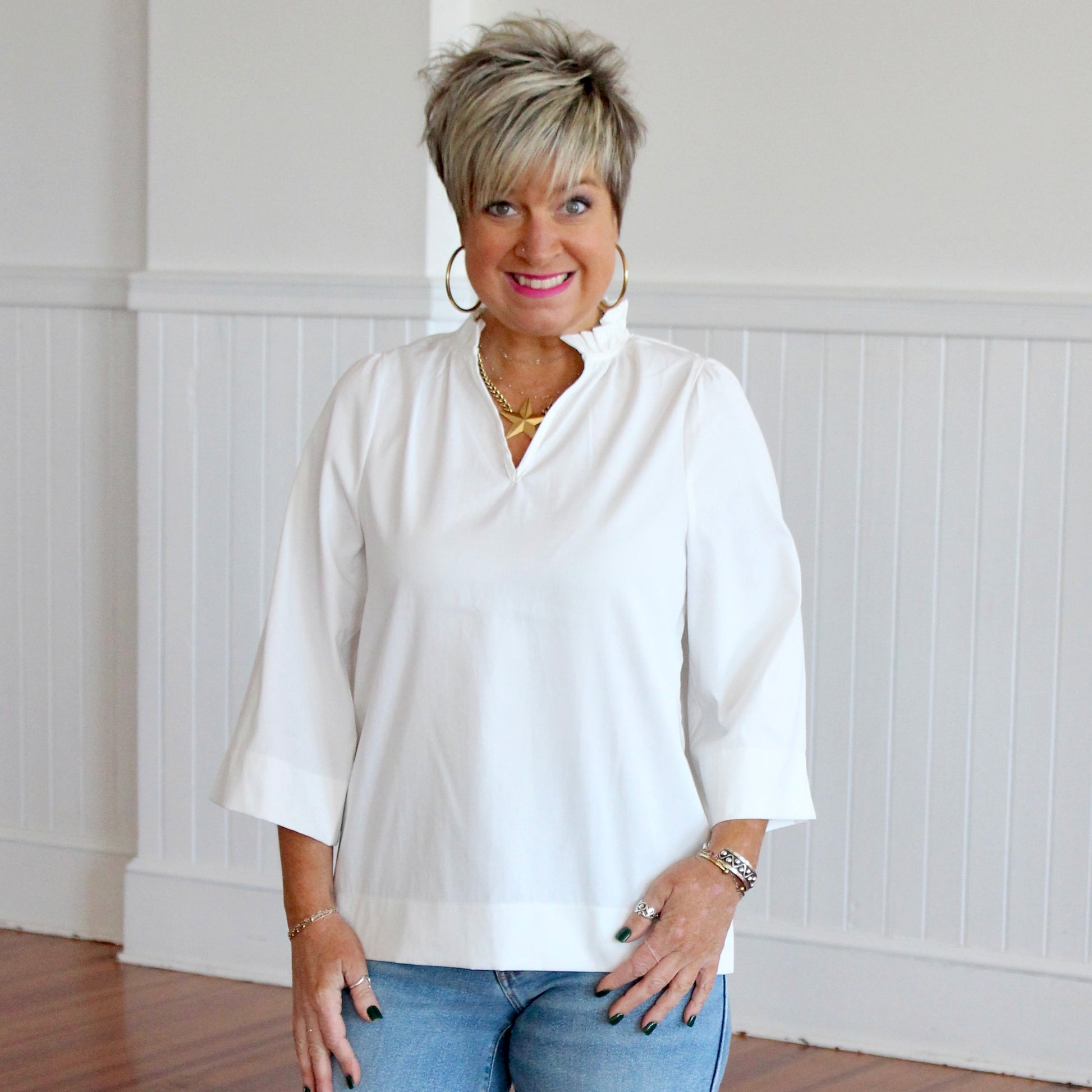 Who doesn't need a versatile white top? This ruffled neck blouse with 3/4 length wide sleeves makes this the perfect top when you need some simply, yet sophisticated.