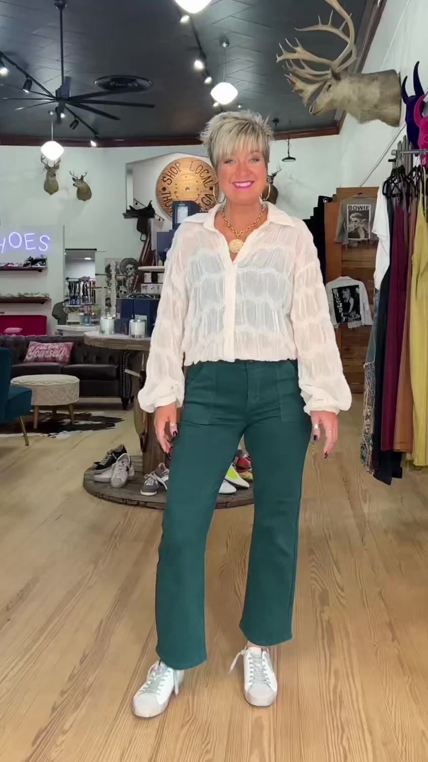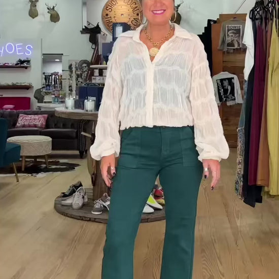 These hunter green jeans will are a must-have for your Fall wardrobe! You will love the amazing fit and stretch of these patch pocket jeans with a slight cropped flare at the ankle.