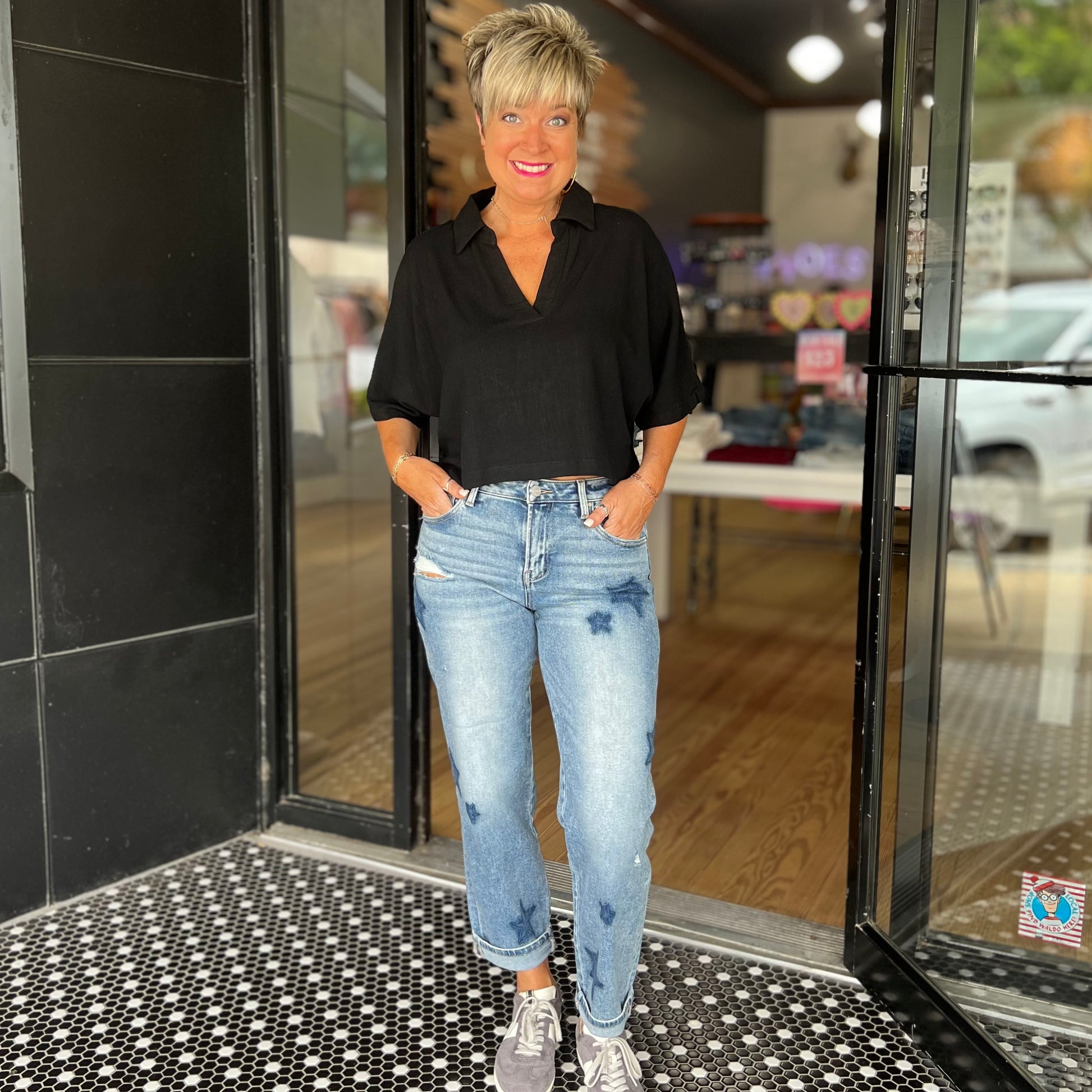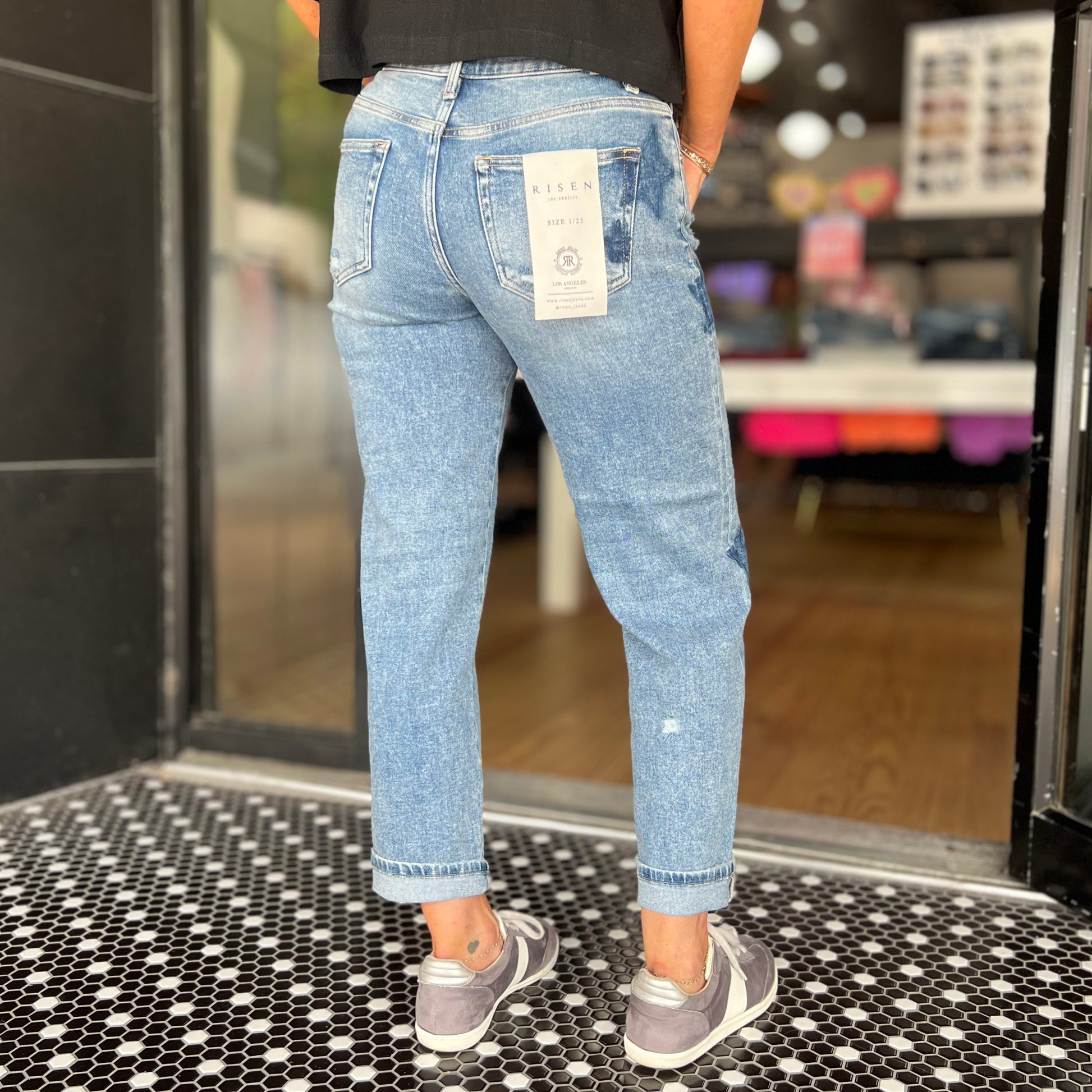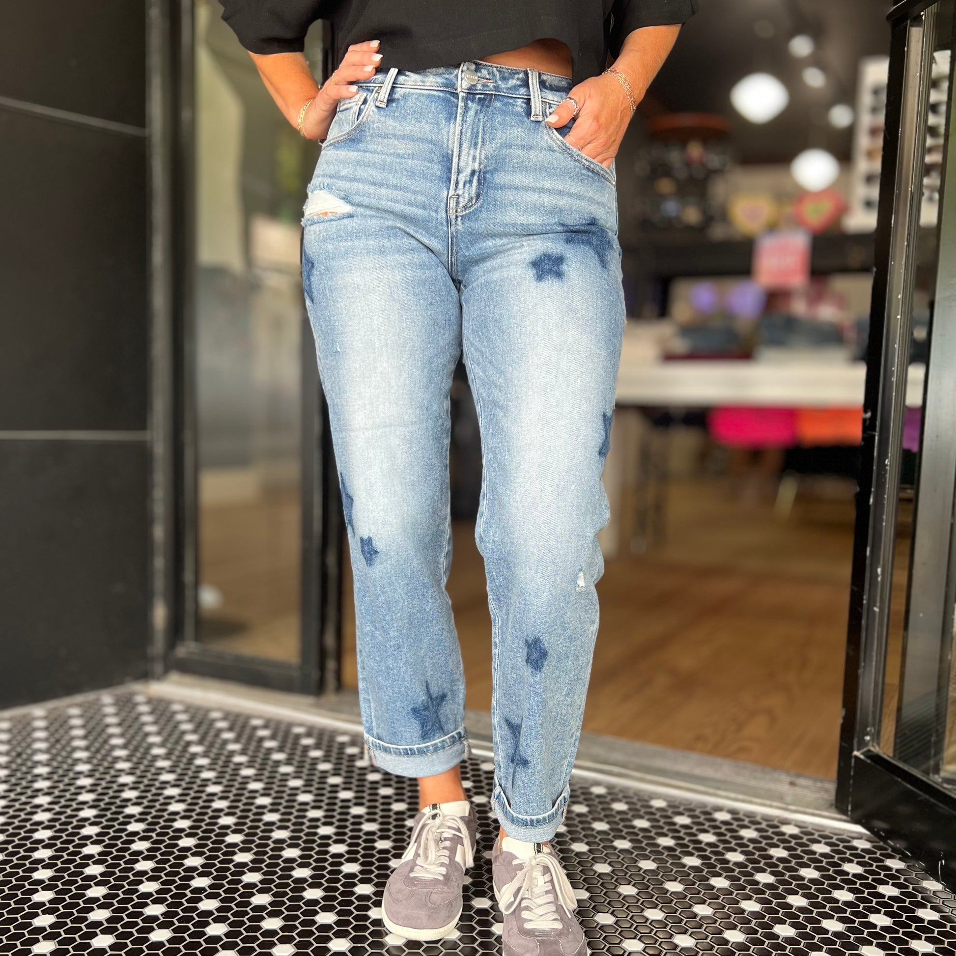 How cute are these? We are bringing back the stars with these mid-rise boyfriend jeans, with a star shadow detailed and a cuffed bottom!