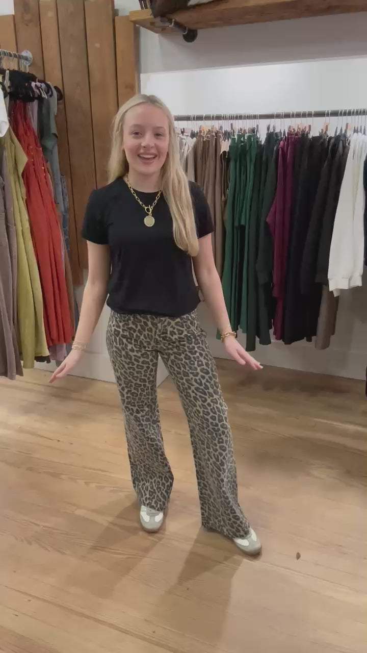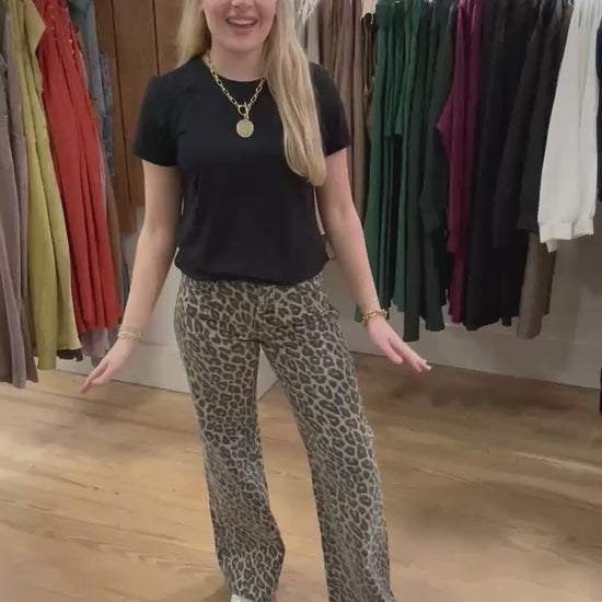 These Risen leopard pants are the ultimate statement-maker, blending street-style edge with laid-back comfort. The mid-rise waist flatters your shape, while the wide-leg silhouette keeps you looking long and lean. Made from lightweight denim that moves with you, they’re easy to wear from morning coffee to evening plans. Style them with a graphic tee and sneakers for weekend fun or dress them up with a fitted bodysuit and heeled boots for a bold, fashion-forward vibe.