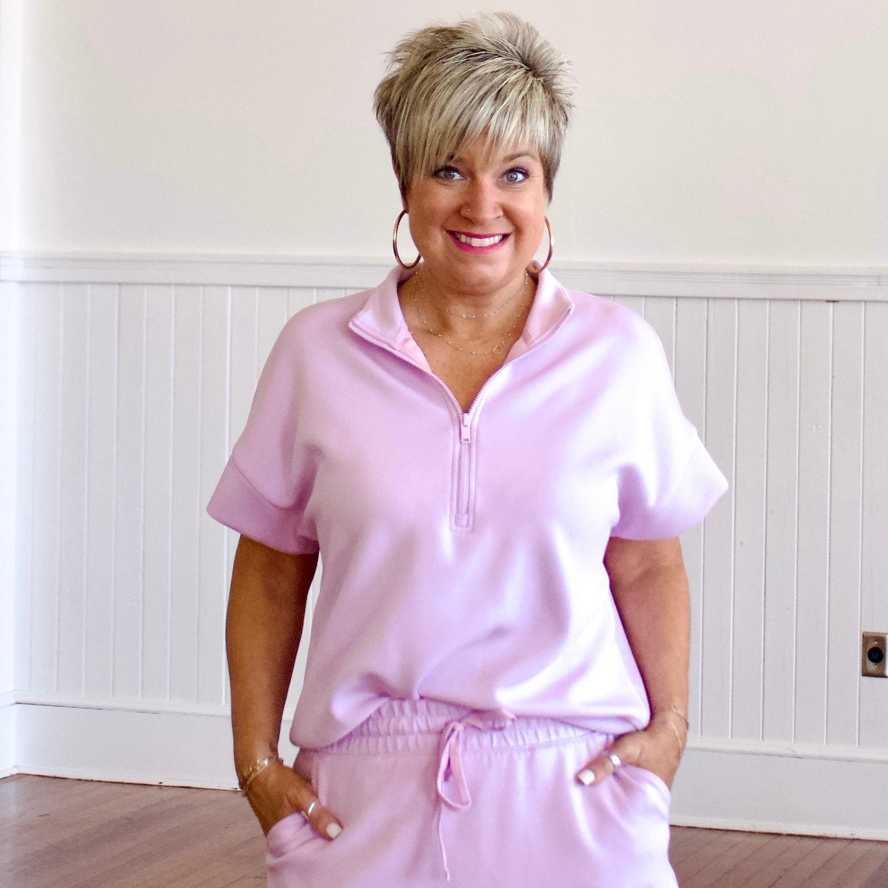 A short sleeve top made from luxurious, silky-smooth fabric, featuring a stylish quarter zip closure. Soft and refined, it adds an elevated touch to your everyday style.
