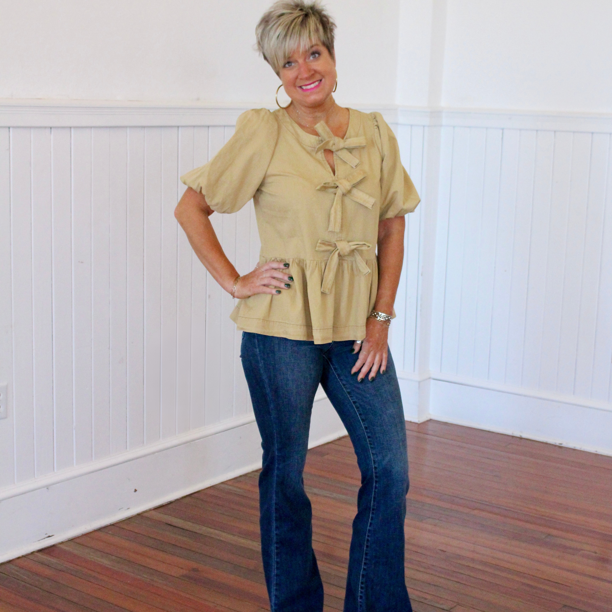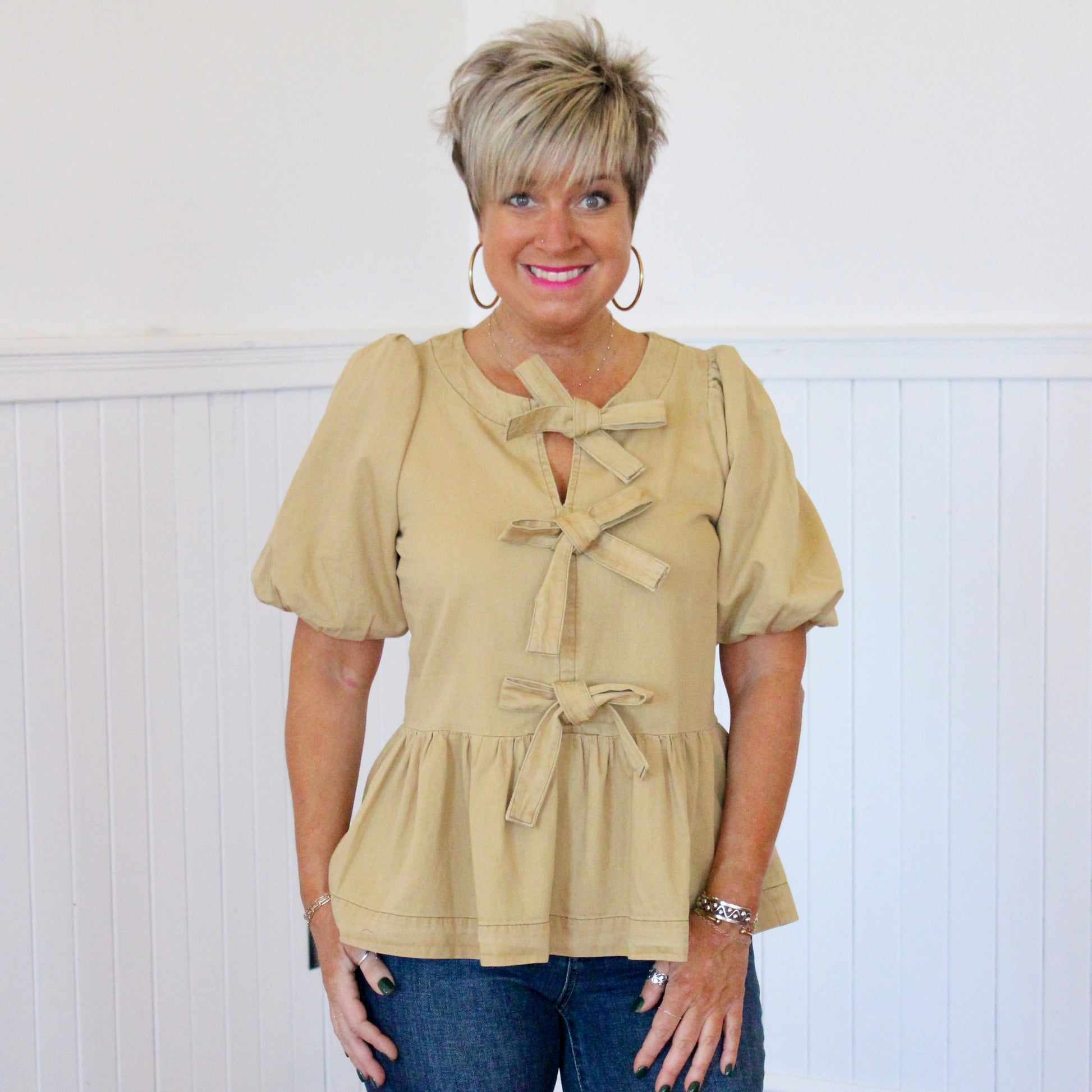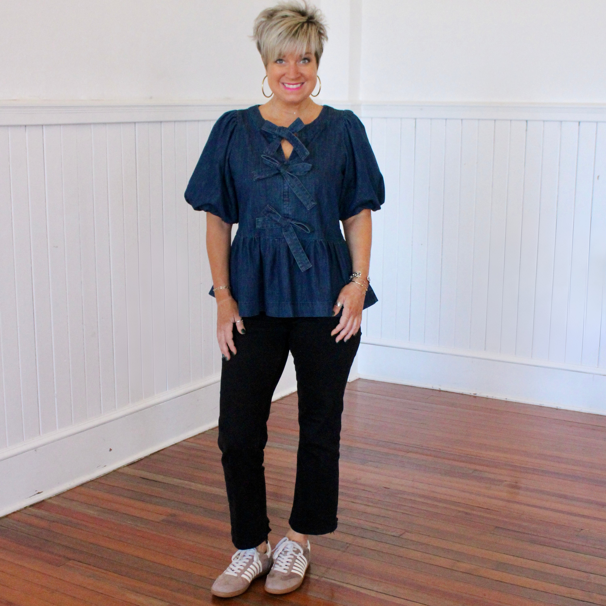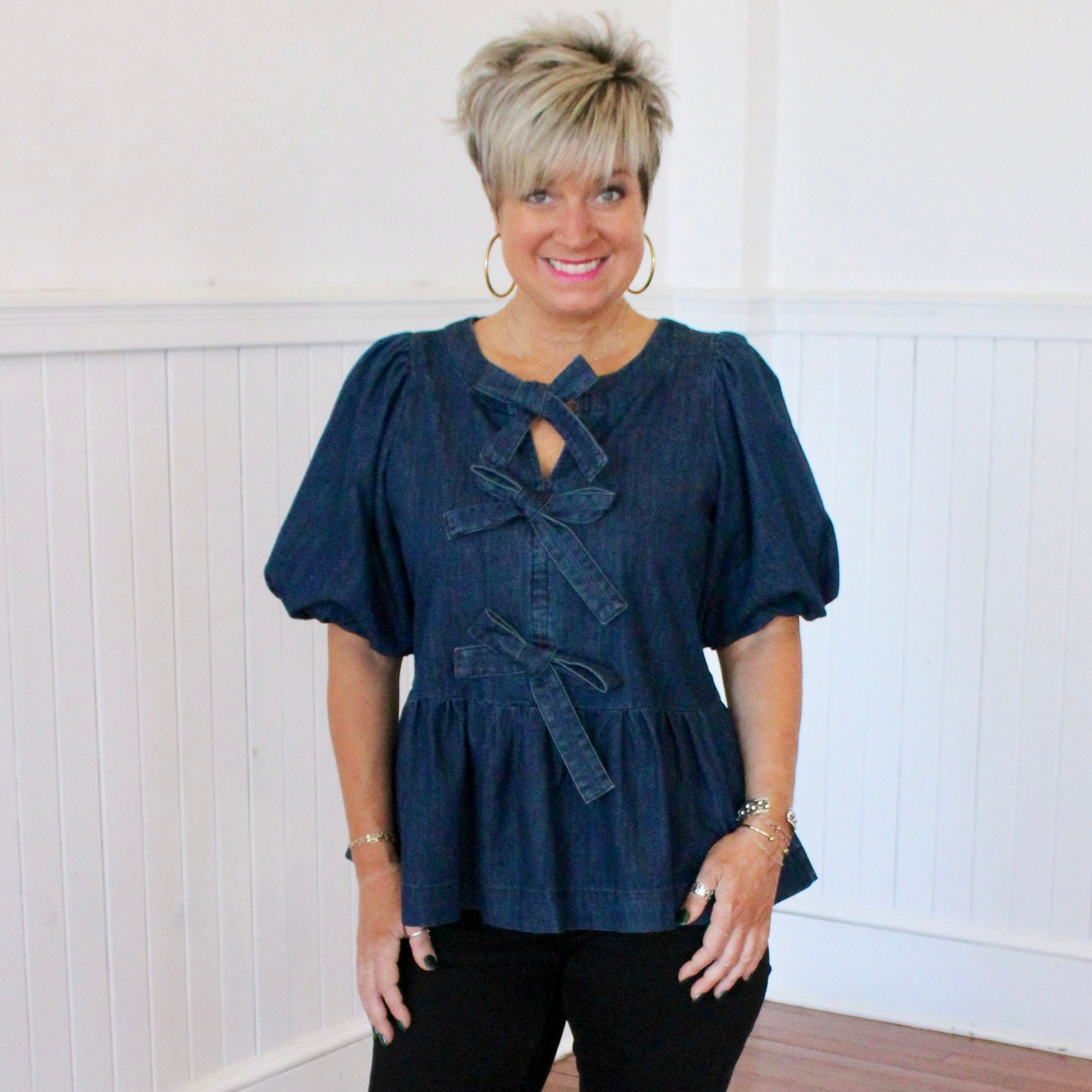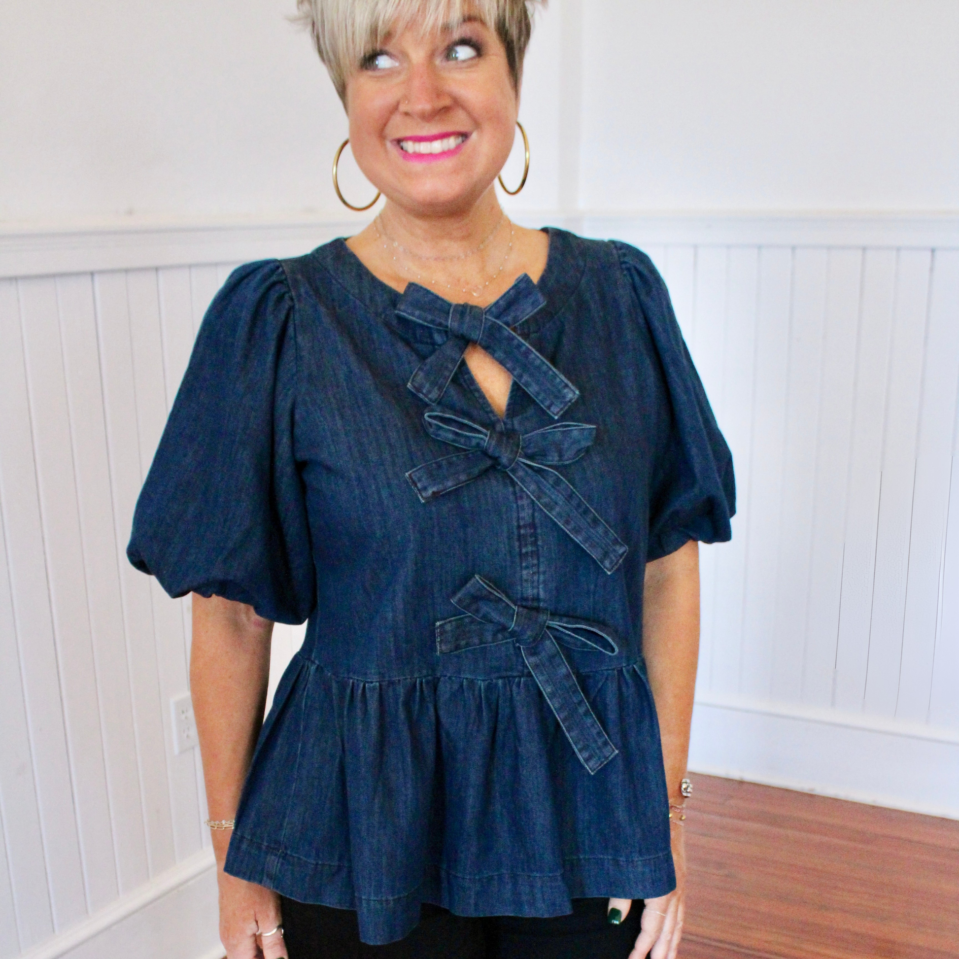 This bow front denim peplum top has all of the details! From the puffed short sleeves with gathered detail to the 3 tied bow closures, you can't go wrong with this stunner! You will be sire to turn heads in this gorgeous top!