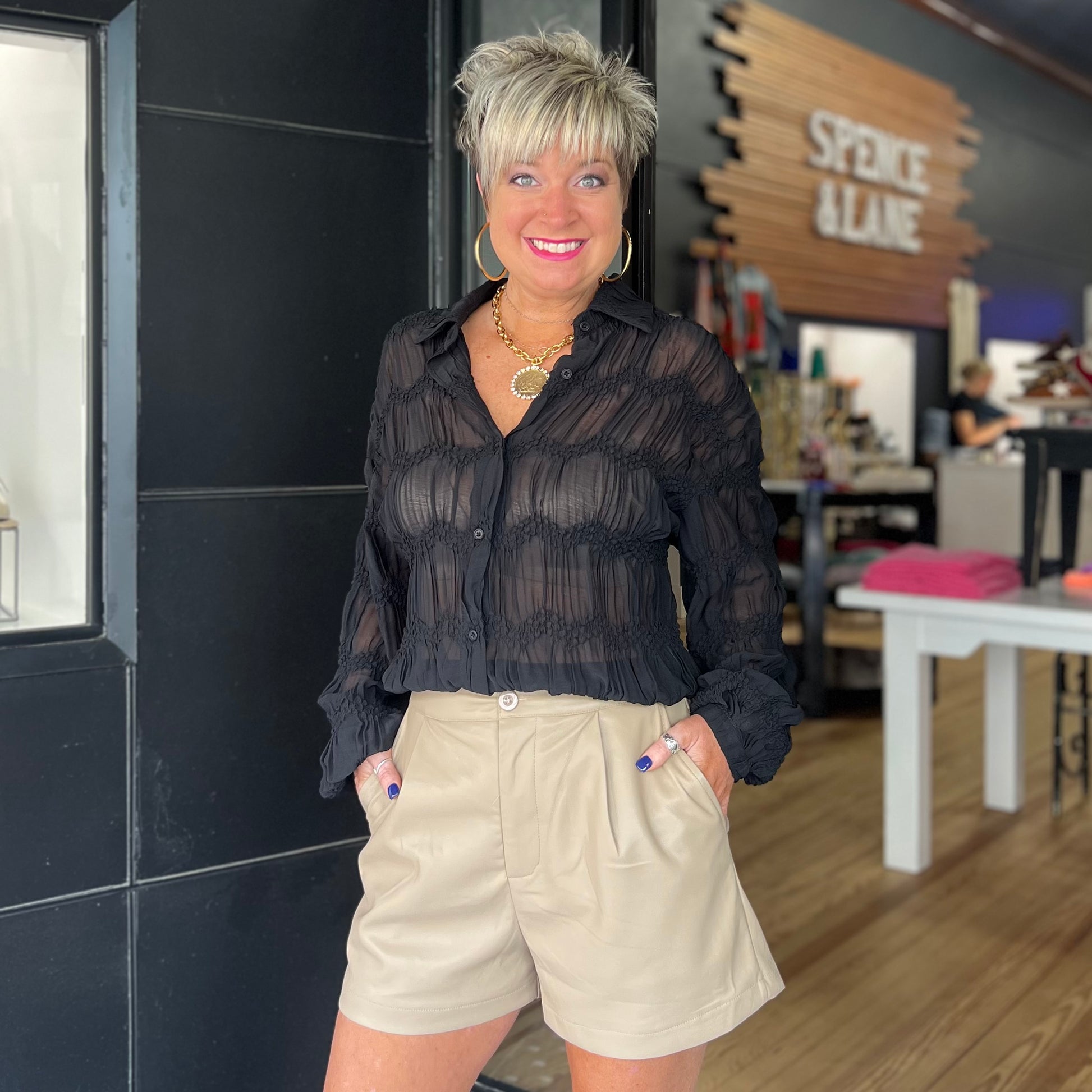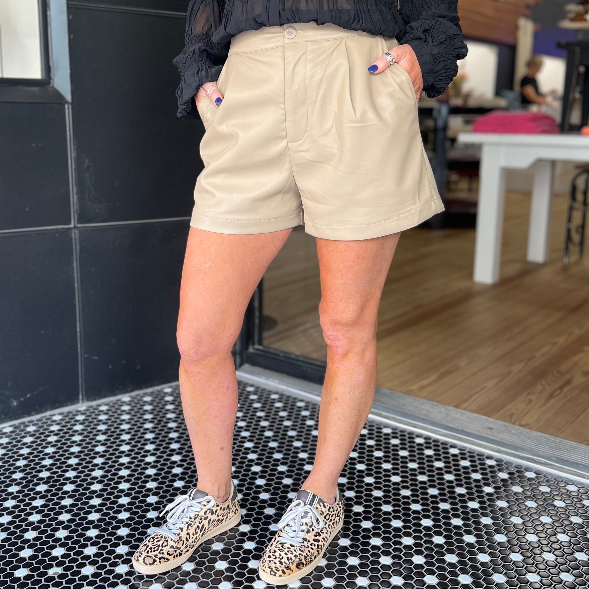 How cute are these soft pleather shorts? The perfect color for football season, easily paired with any color! These shorts are high-waisted for the most flattering fit with the pleated detail and POCKETS!