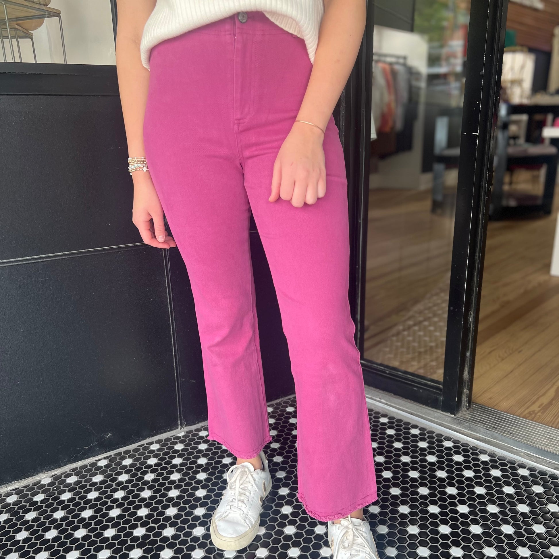 Soft washed pants with very comfortable stretchy fabric. Made from an adaptable fabric featuring high-rise, button closure at front and wide leg that hits above the ankle. The cut edge at detail on the bottom makes your look special. Pair with your favorite top and shoes for a variety look!