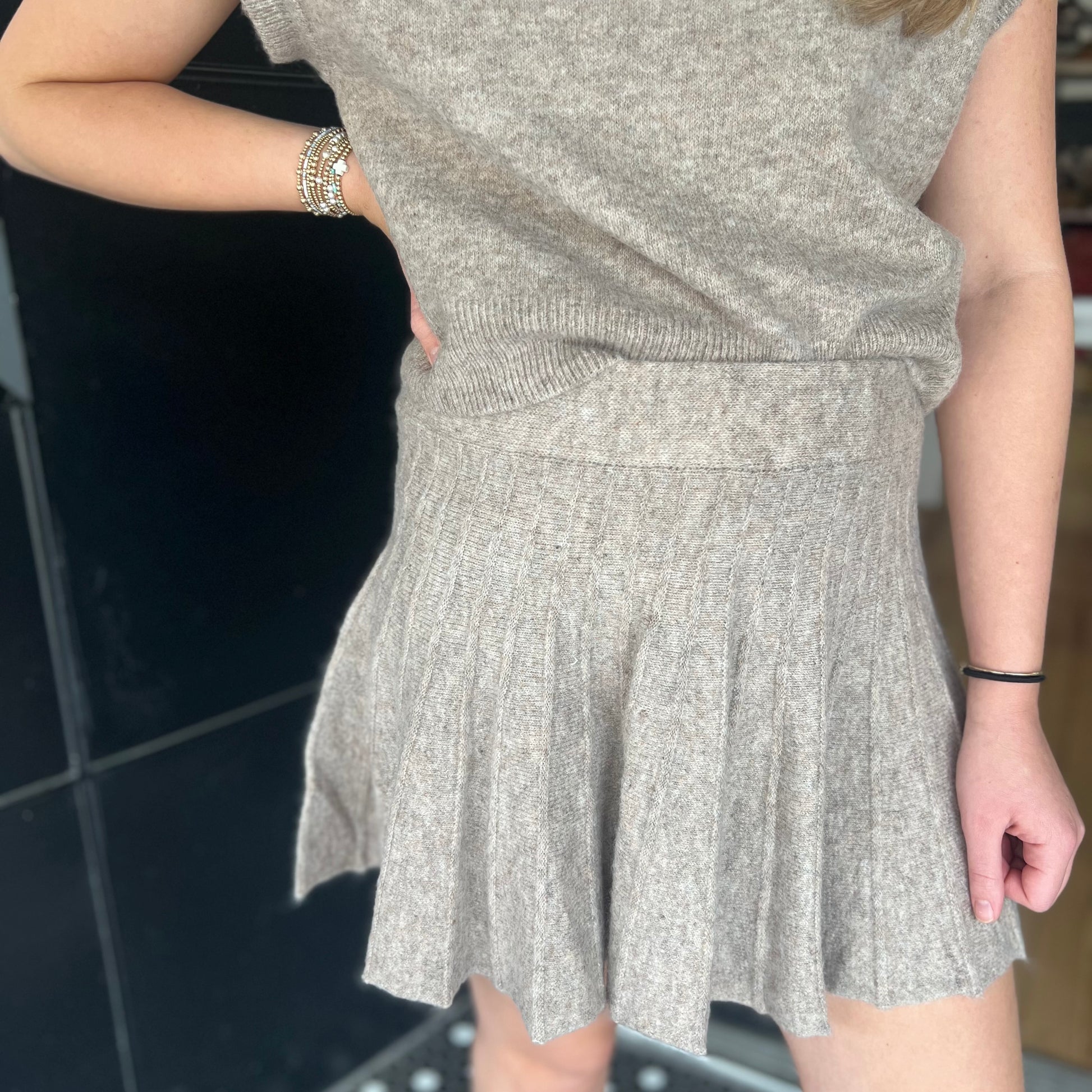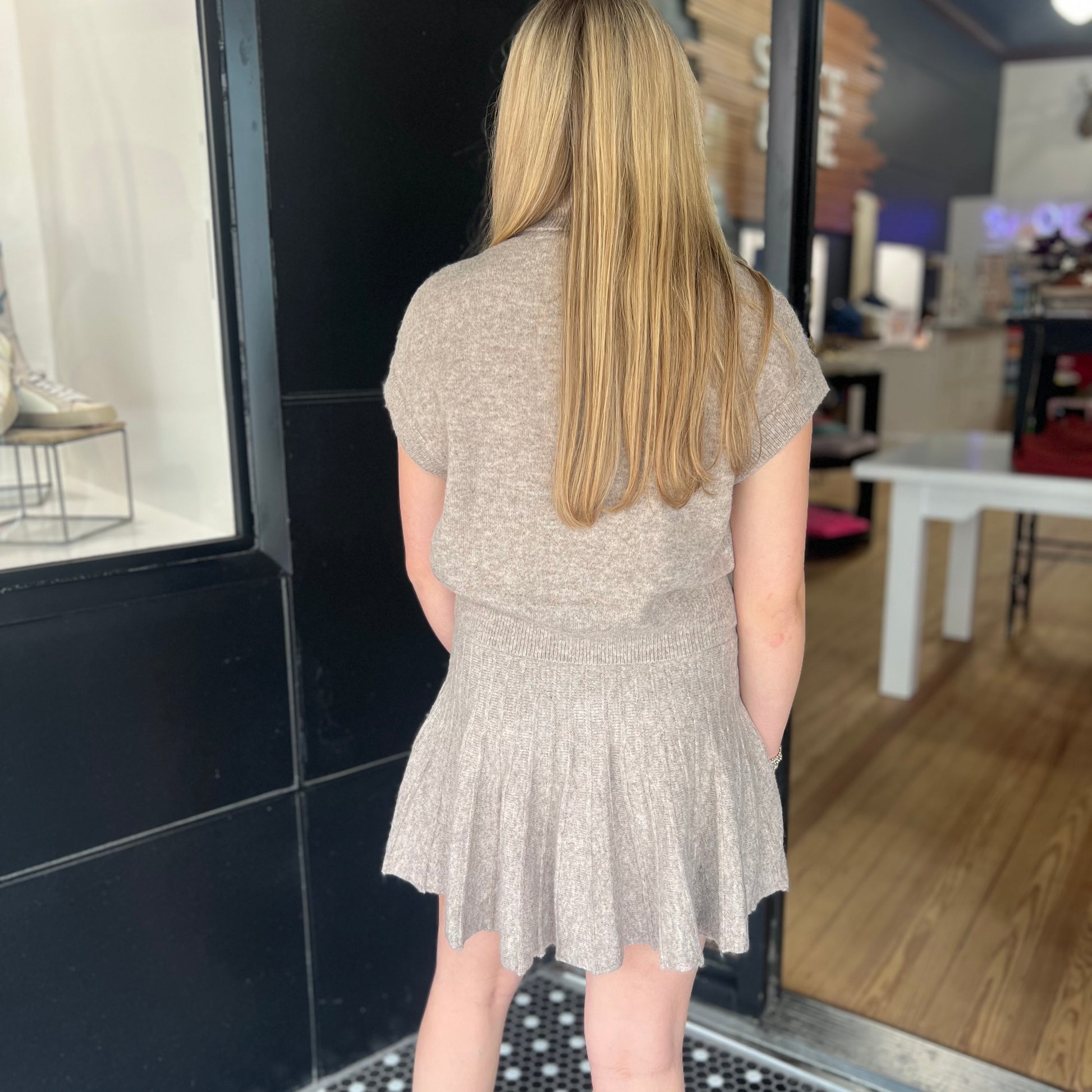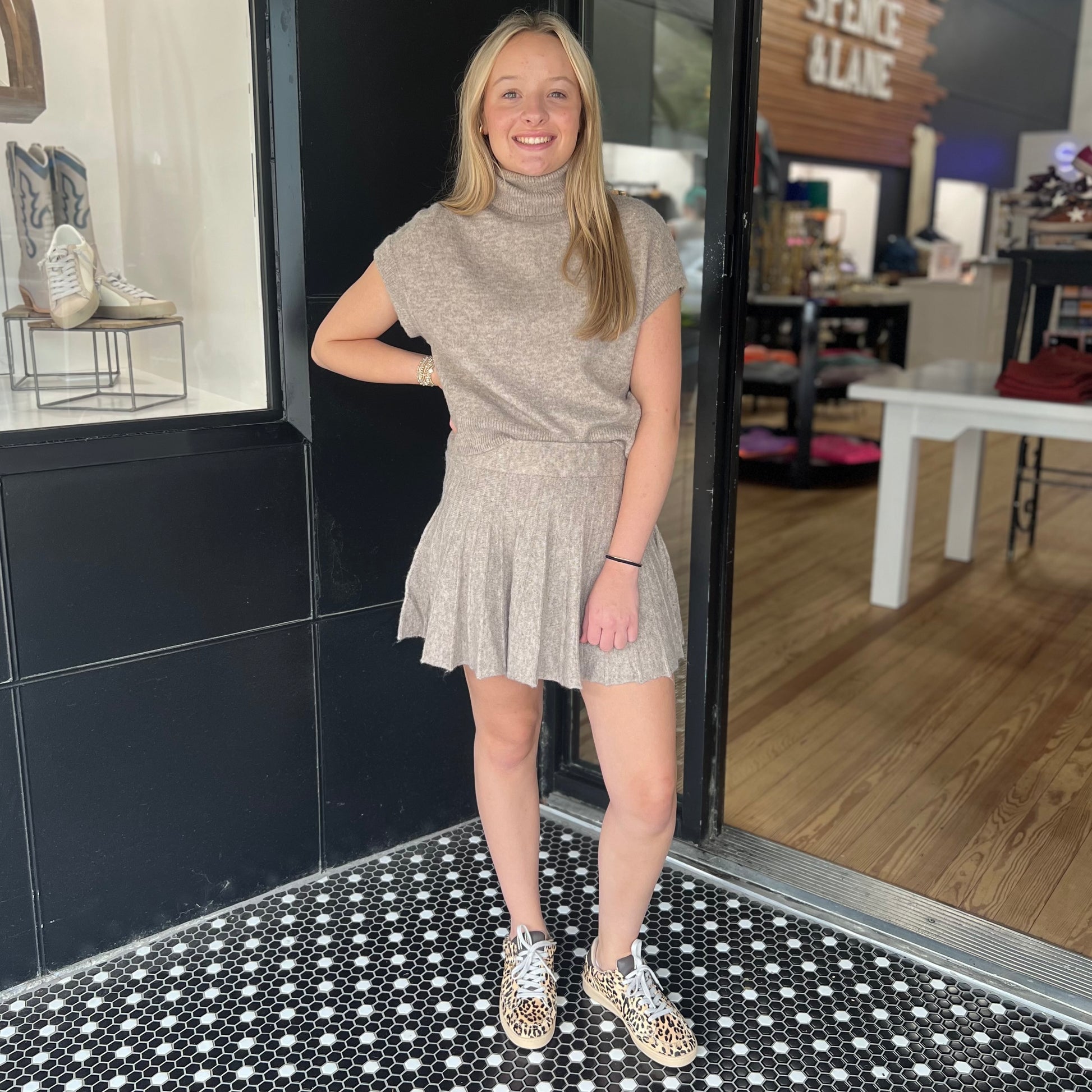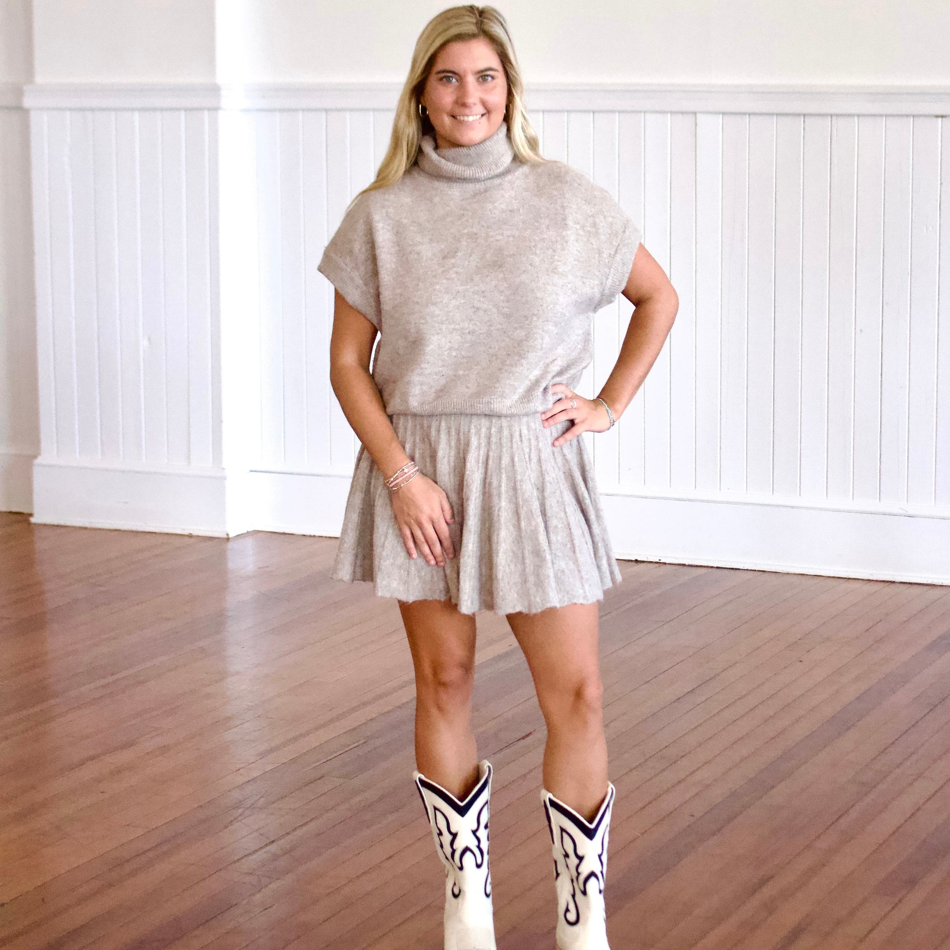 This set is a must-have for all of you college girls!! Super cute top with turtleneck and sleeveless style! Pleated skirt with elastic waistband. Add this set to your wardrobe today!