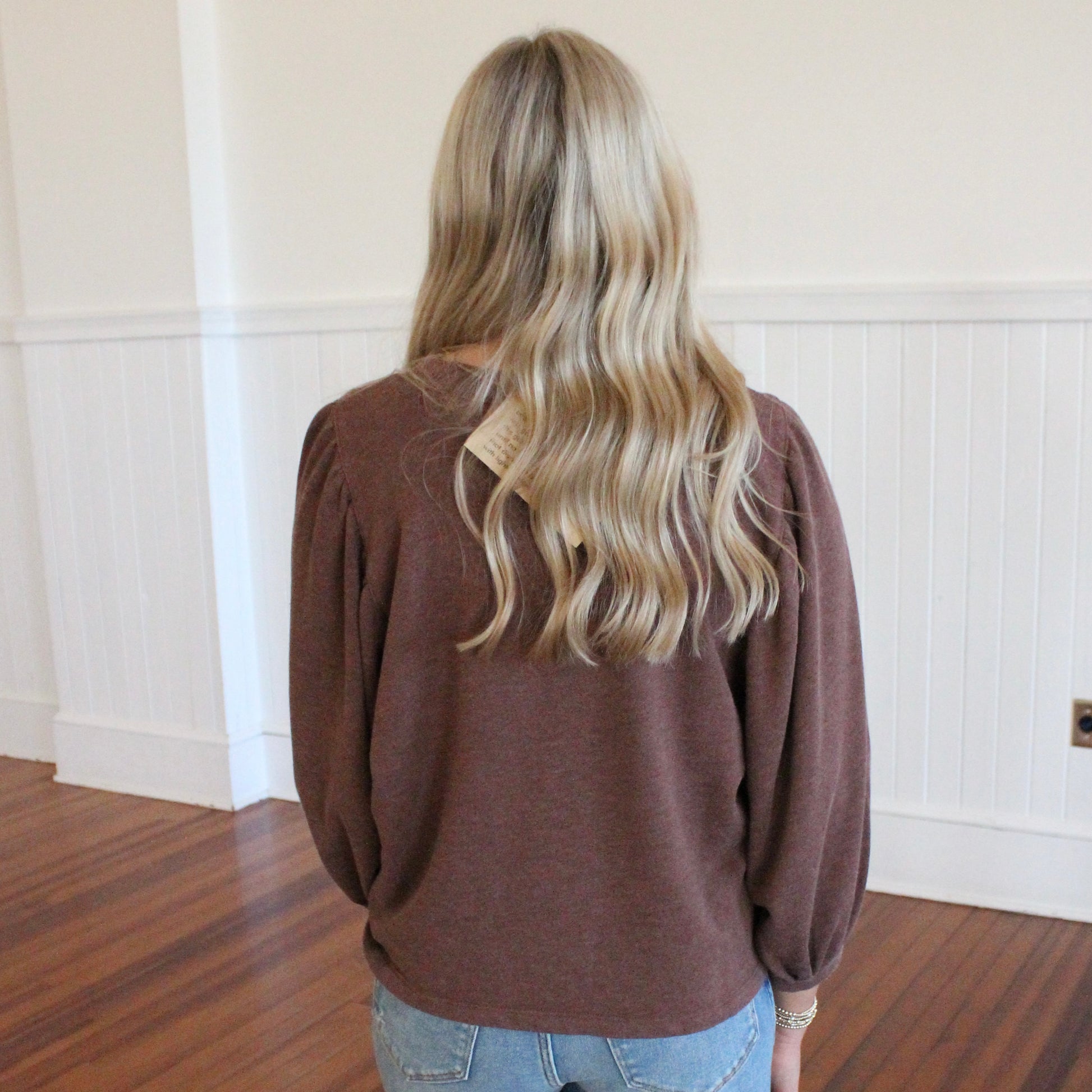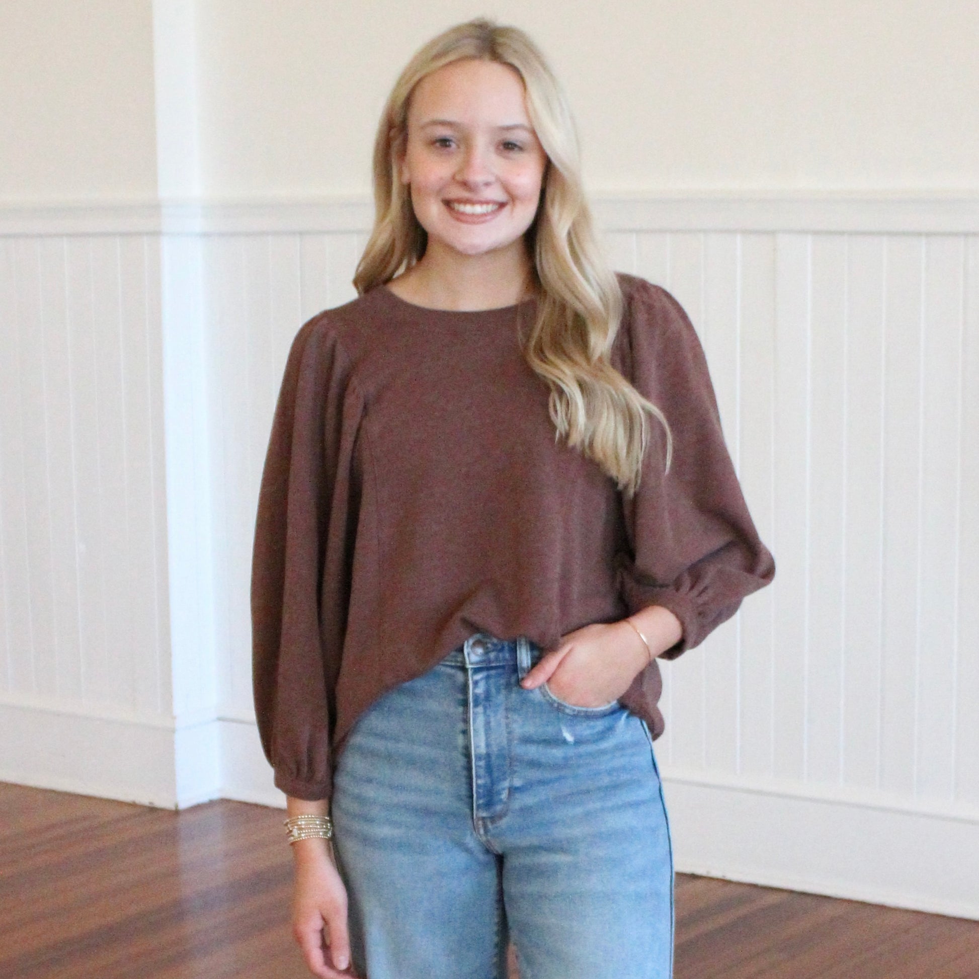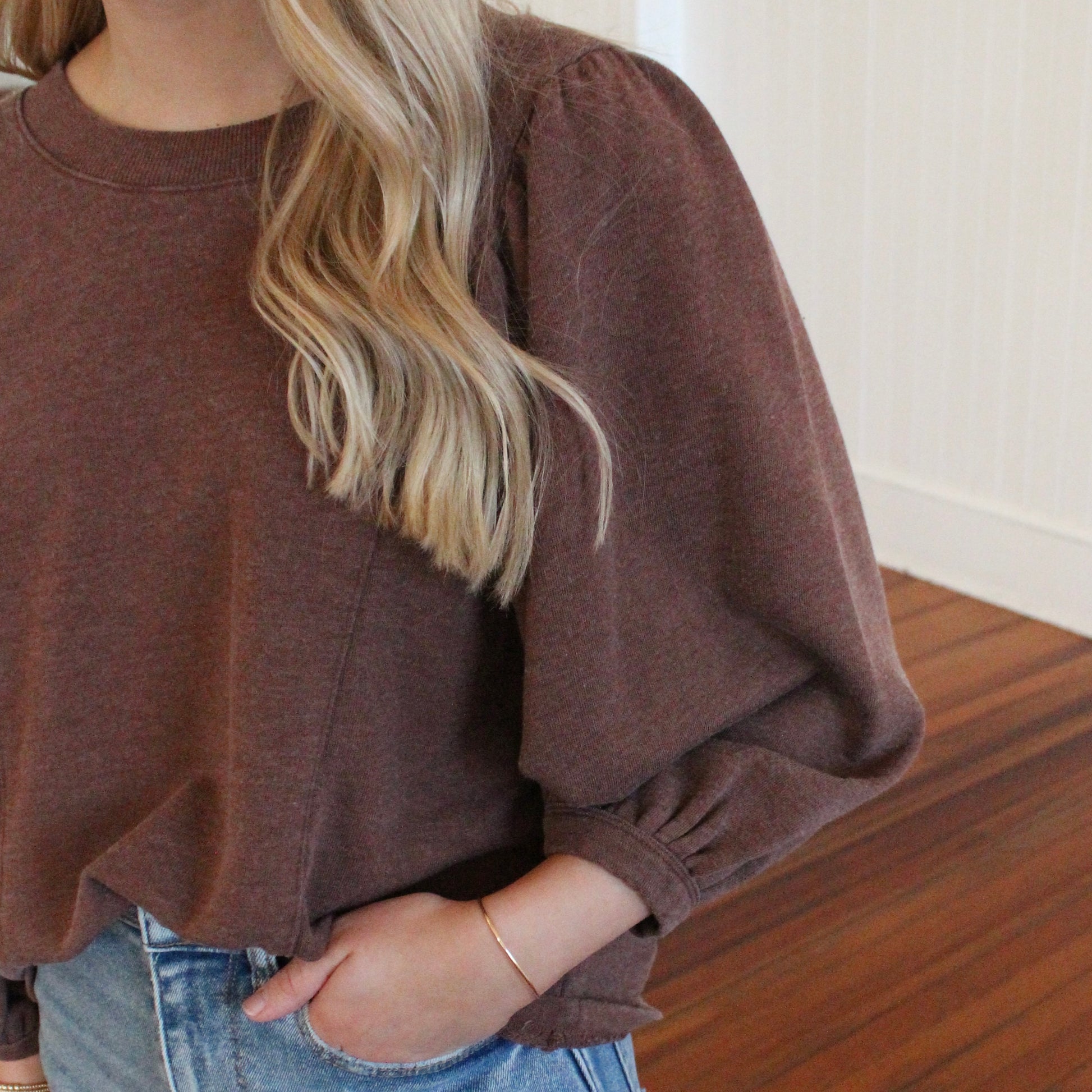 A must-have in your winter wardrobe! This top is simple, yet effective! Easily styled, this sweatshirt with the shirring half sleeve is a favorite in our New Arrivals.